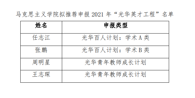 根据学校《关于开展2021年“光华英才工程”申报工作的通知》的要求,allwincity万象城官方网站严格遵照申报标准及程序,在老师个人申报基础上,经学校相关部门认定成果、学院党总支委员会政治把关、学院教授委员会、党政联席会研究决定,拟推荐任志江等4位老师参加学校“光华英才工程”项目评选。
